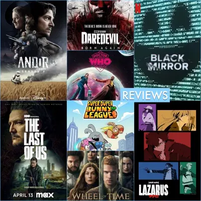 Reviews: Andor s2 premiere, Black Mirror s7, Daredevil: Born Again s1, Doctor Who s15 premiere, The Last of Us s2, Lazarus s1, Super Duper Bunny League series premiere, The Wheel of Time s3.
