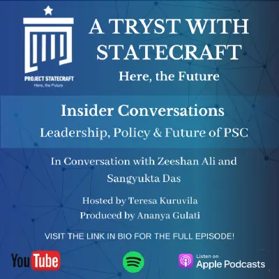Join host Teresa Kuruvila in this episode of Insider Conversations, produced by Ananya, as we sit down with Sangyukta Das, Editor-in-Chief at Project Statecraft (PSC), and Zeeshan Ali, Director of Public Policy. They share their journeys in leadership, policy research, and youth empowerment, offering a behind-the-scenes look at the organization.