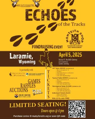 On April 5th, 2025, the Muley Fanatic Foundation will host its first-ever "Echoes of the Tracks" event in Laramie, Wyoming. This special fundraiser and gathering will be held in partnership with the Monteith Shop, the University of Wyoming, and the Haub School of Environment and Natural Resources. It’s an evening designed to bring together science, conservation, and community, celebrating the shared commitment to the future of mule deer and the wild places they roam.